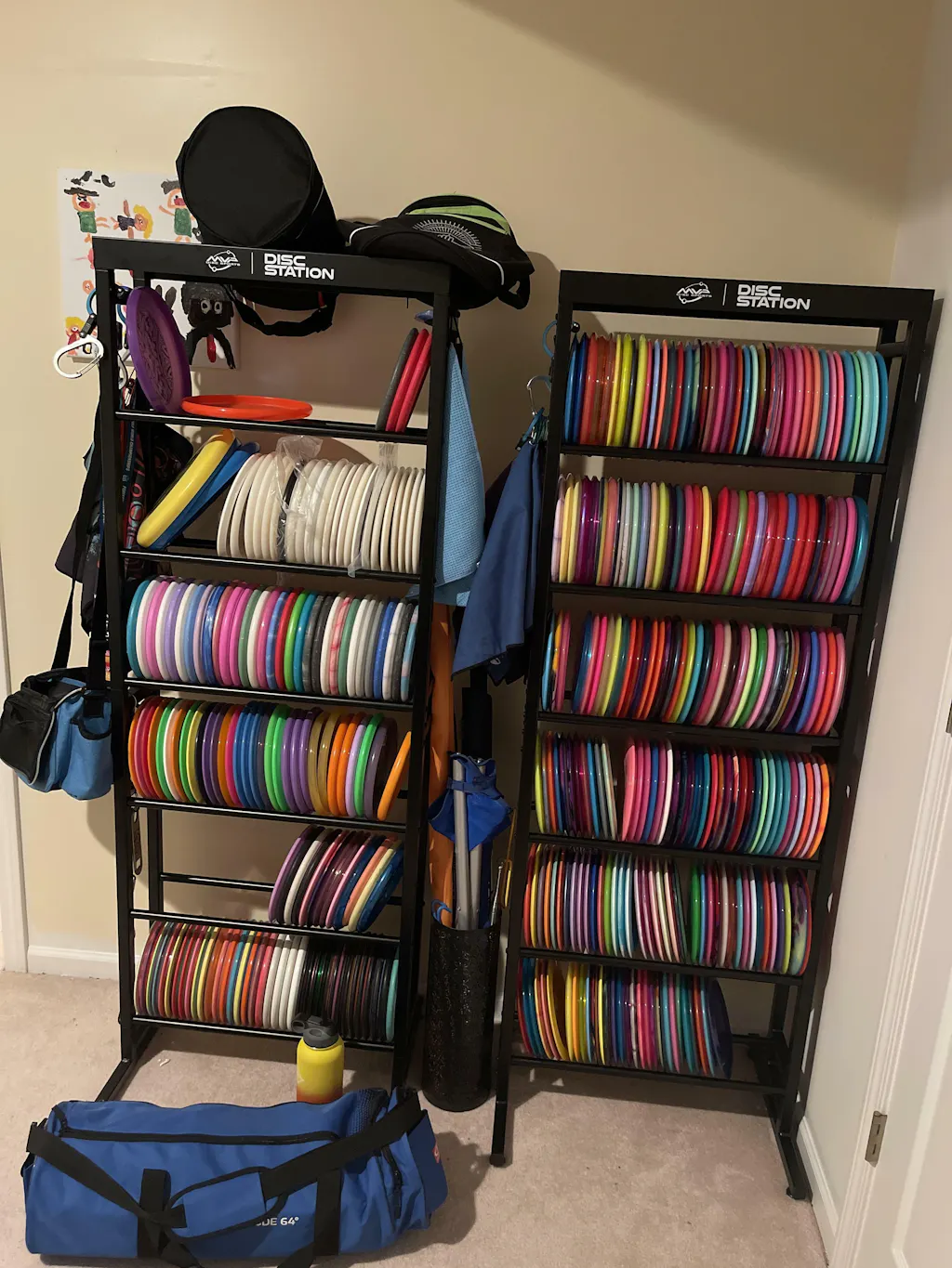 Love this product so much I immediately bought another one. The only complaint I have is the packaging. Both boxes were torn and some metal was bent or missing paint. They really should invest in better packing. Besides that, each shelf can hold one of the plastic dynamic disk bins worth of discs. It replaces 6 of those.